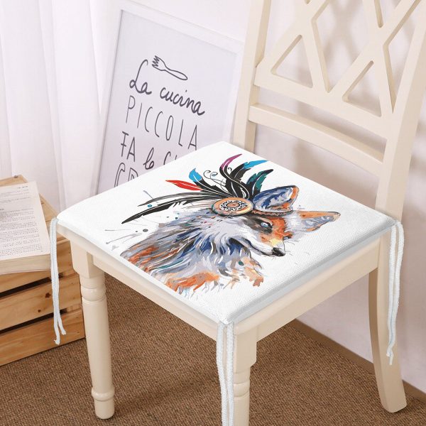 Beyaz Zeminde Suluboya Kurt Desenli Fermuarlı Sandalye Minderi