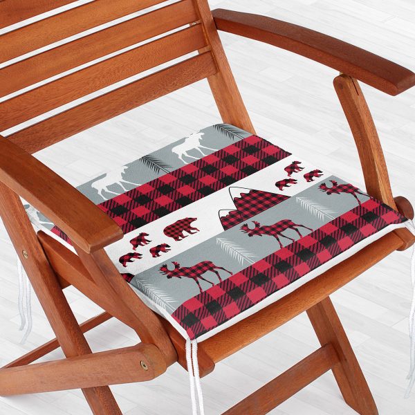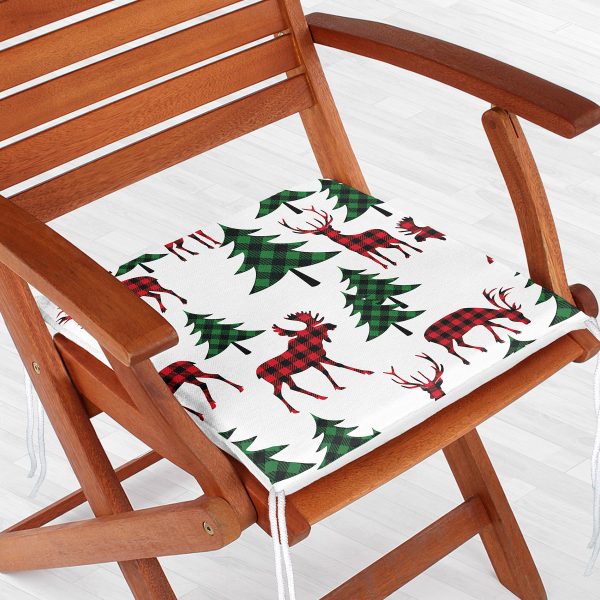 Beyaz Zemin Üzerinde Çam Ağaçlı Ekoseli Geyik Motifli Dijital Baskılı Modern Fermuarlı Sandalye Minderi
