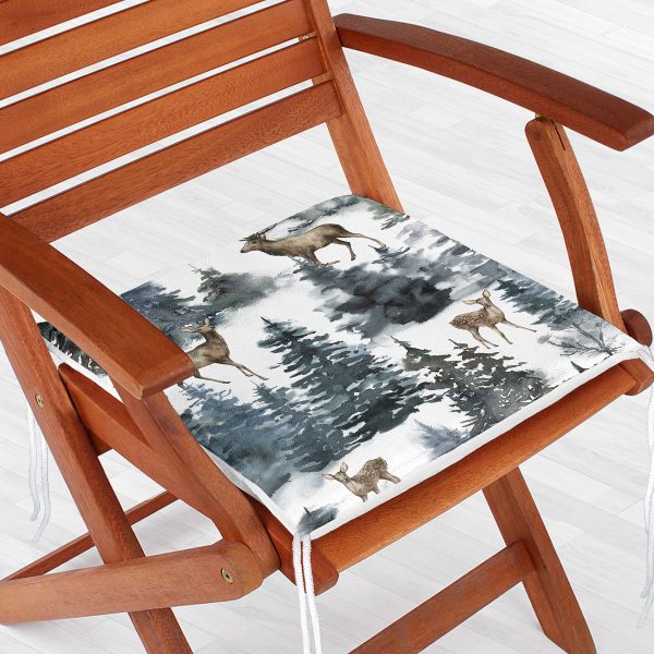 Suluboya Çam Ağacı & Geyik Tasarımlı Dijital Baskılı Modern Fermuarlı Sandalye Minderi
