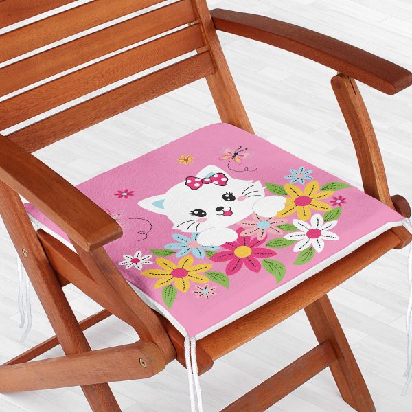 Çiçeklerin İçindeki Sevimli Kedi Desenli Modern Fermuarlı Sandalye Minderi