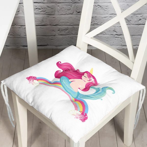 Realhomes Beyaz Zeminde Denizkızı Desenli Dijital Baskılı Modern Pofuduk Sandalye Minderi