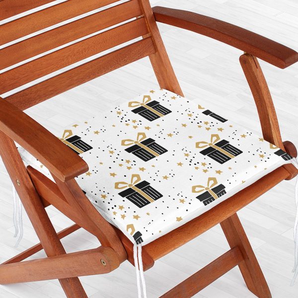 Beyaz Zemin Üzerinde Gold Detaylı Hediye Paketi Desenli Dijital Baskılı Modern Fermuarlı Sandalye Minderi