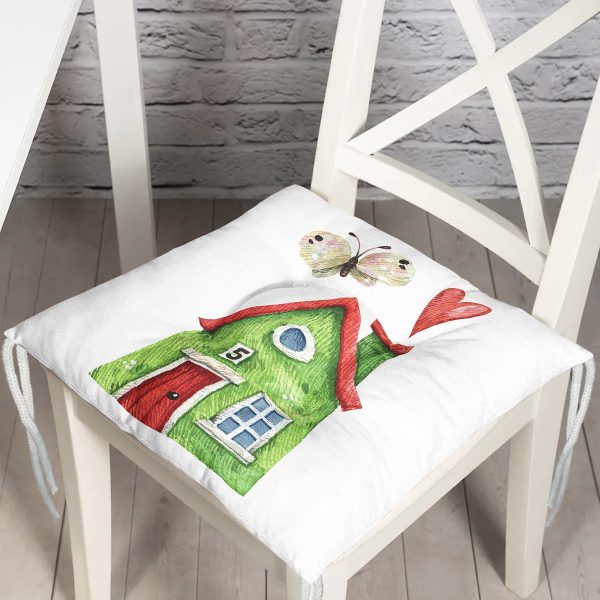 Minyatür Yeşil Ev Çizimli Dijital Baskılı Modern Pofuduk Sandalye Minderi