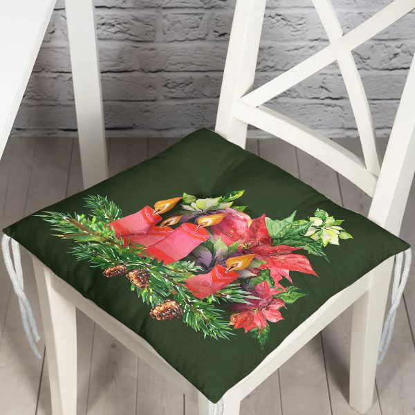 Yeşil Zemin Çam Yapraklı Mum Tasarımlı Dijital Baskılı Modern Pofuduk Sandalye Minderi