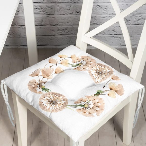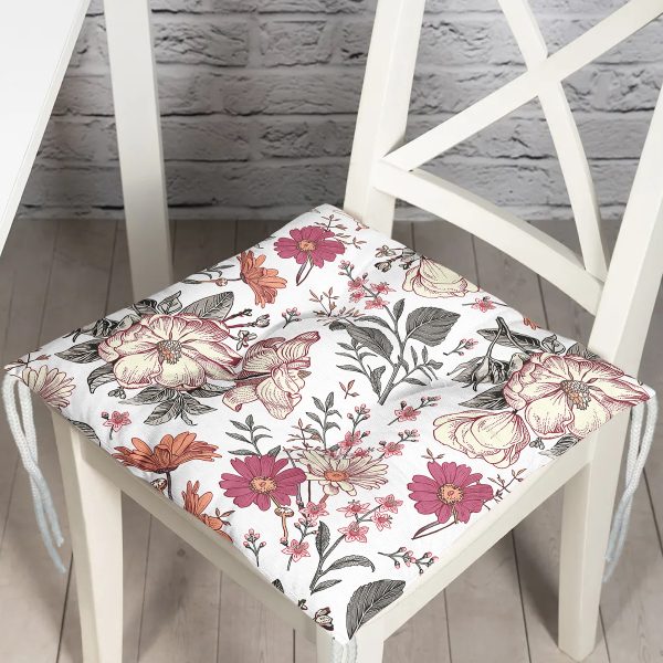 Beyaz Zemin Üzerinde Çiçek Desenli Dijital Baskılı Modern Pofuduk Sandalye Minderi
