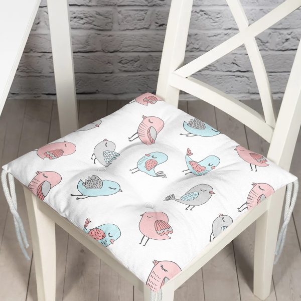 Realhomes Mavi Pembe Kuş Çizimli Özel Tasarım Dijital Baskılı Modern Pofuduk Sandalye Minderi