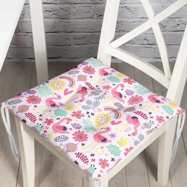 Pembe Pelikan Ve Çiçek Desenli Dijital Baskılı Özel Tasarım Modern Pofuduk Sandalye Minderi