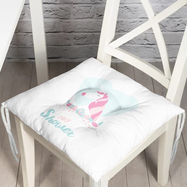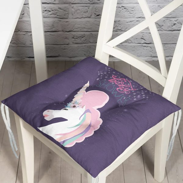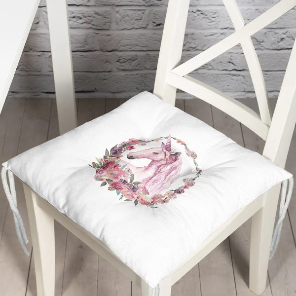 Unicorn Ve Çiçek Desenli Tasarımlı Dijital Baskılı Modern Pofuduk Sandalye Minderi