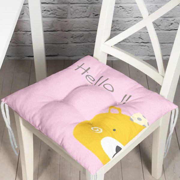 Pembe Zeminde Sarı Ayıcık Hello Motifli Çocuk Odası Pofuduk Sandalye Minderi