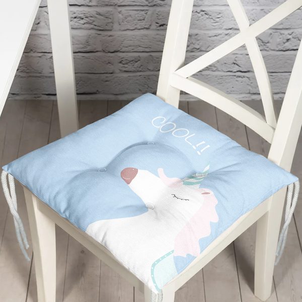 Mavi Zemin Cool Yazılı Unicorn Baskılı Dijital Baskılı Çocuk Odası Pofuduk Sandalye Minderi