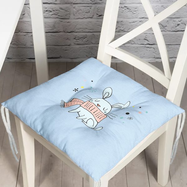 Mavi Zeminli Atkılı Tavşan Motifli Dijital Baskılı Modern Pofuduk Sandalye Minderi