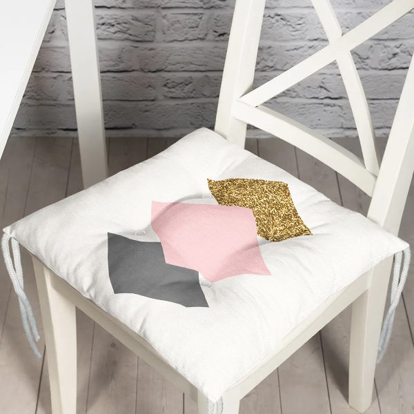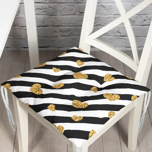 Beyaz Zemin Üzerinde Gold Detaylı Kalp Dijital Baskılı Modern Pofuduk Sandalye Minderi