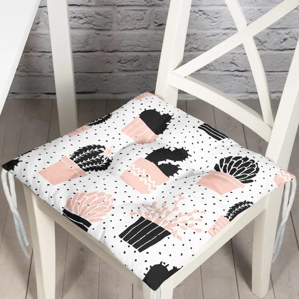 Beyaz Zemin Üzerinde Siyah Puantiyeli Kaktüs Desenli Dijital Baskılı Modern Pofuduk Sandalye Minderi