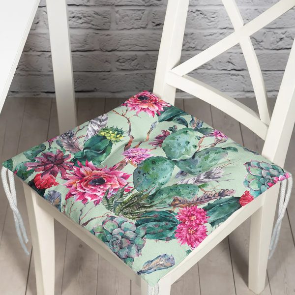 Renkli Zemin Üzerinde Kaktüs Desenli Dijital Baskılı Modern Pofuduk Sandalye Minderi