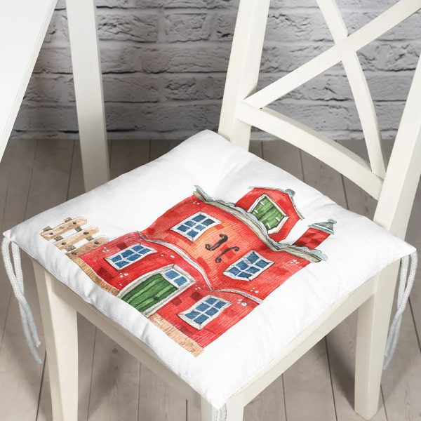 Minyatür Kırmızı Ev Çizimli Dijital Baskılı Modern Pofuduk Sandalye Minderi