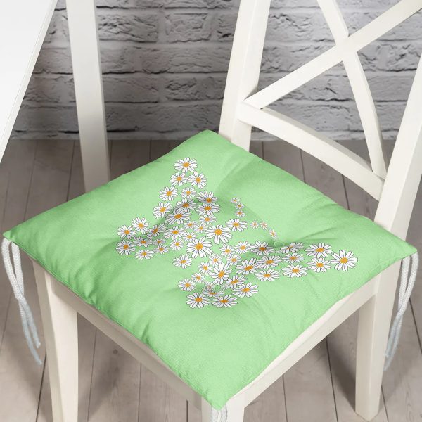 Yeşil Zemin Papatyadan Kelebek Tasarımlı Dijital Baskılı Modern Pofuduk Sandalye Minderi