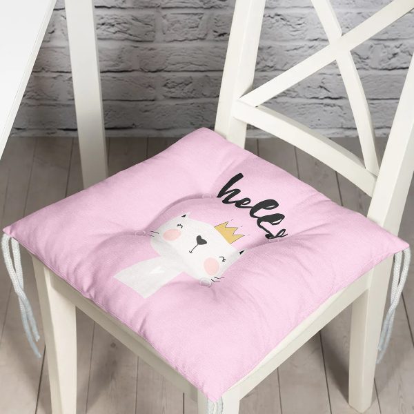 Pembe Zeminde Hello Kedicik Özel Tasarımlı Modern Pofuduk Sandalye Minderi