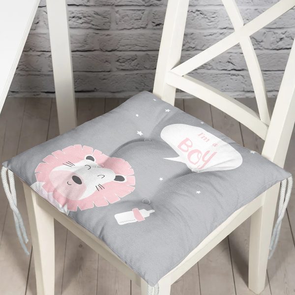 Gri Zemin I’m A Boy Yazılı Aslan Desenli Dijital Baskılı Çocuk Odası Pofuduk Sandalye Minderi