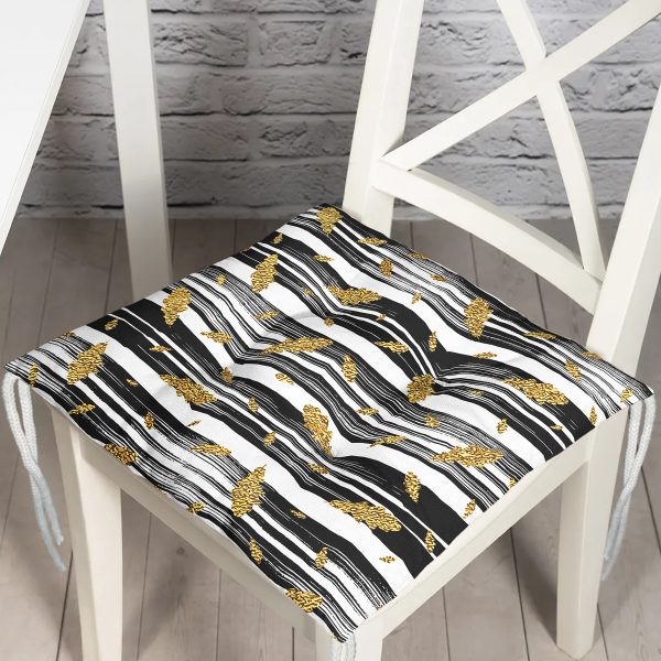 Siyah Beyaz Zeminli Gold Yaprak Desenli Dijital Baskılı Modern Pofuduk Sandalye Minderi