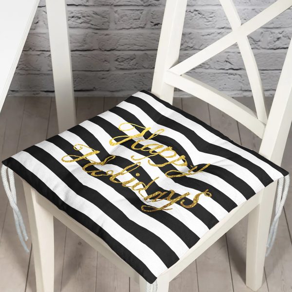Beyaz Zeminde Siyah Çizgili Gold Yazılı Happy Holidays Yazılı Dijital Baskılı Modern Pofuduk Sandalye Minderi