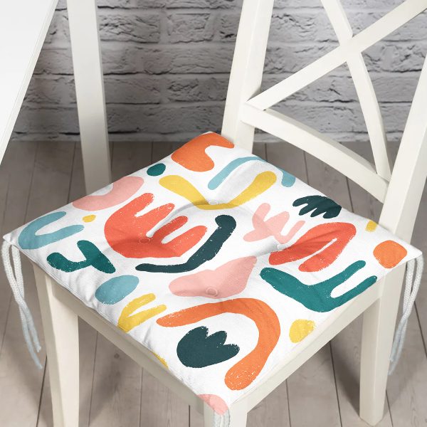 Beyaz Zemin Üzerinde Renkli Soyut Çizim Dijital Baskılı Modern Pofuduk Sandalye Minderi