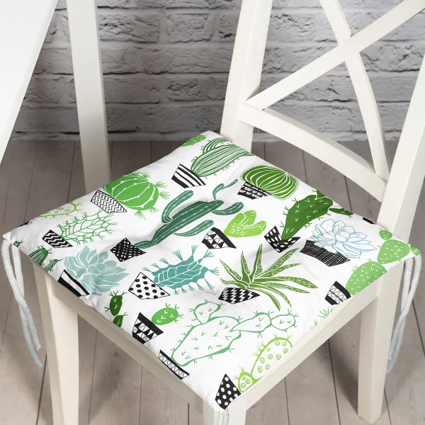 Beyaz Zemin Üzerinde Yeşil Kaktüs Desenli Dijital Baskılı Modern Pofuduk Sandalye Minderi
