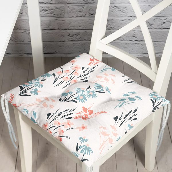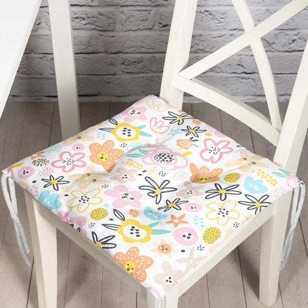 Beyaz Zeminde Rengarenk Çiçek Desenli Dijital Baskılı Modern Pofuduk Sandalye Minderi