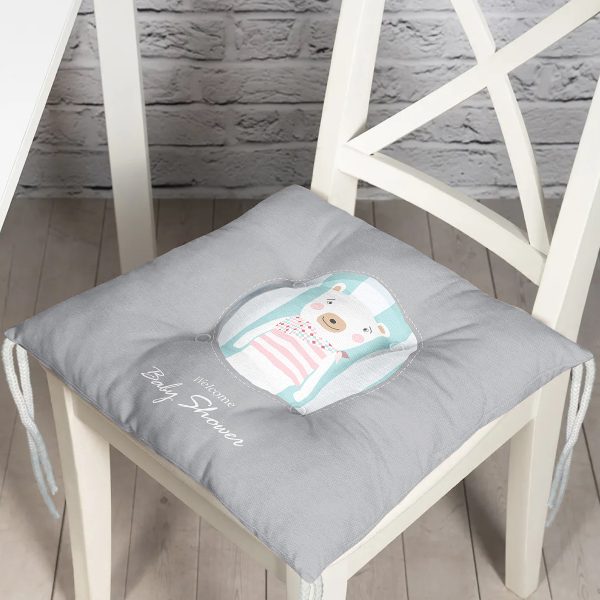 Gri Zeminde Welcome Baby Shower Temalı Sevimli Ayıcık Modern Pofuduk Sandalye Minderi