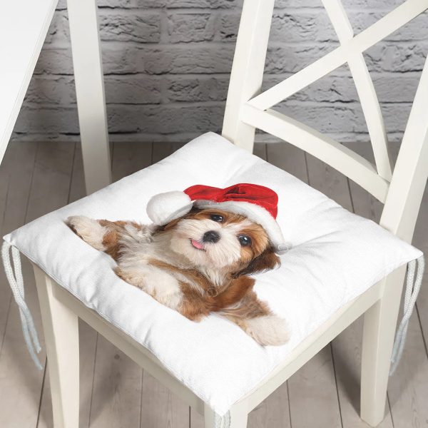Yılbaşı Şapkalı Köpek Desenli Dijital Baskılı Modern Pofuduk Sandalye Minderi