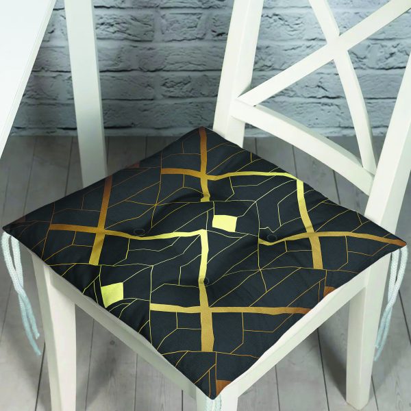 Koyu Zeminde Altın Rengi Geometrik Desenli Dijital Baskılı Modern Pofuduk Sandalye Minderi