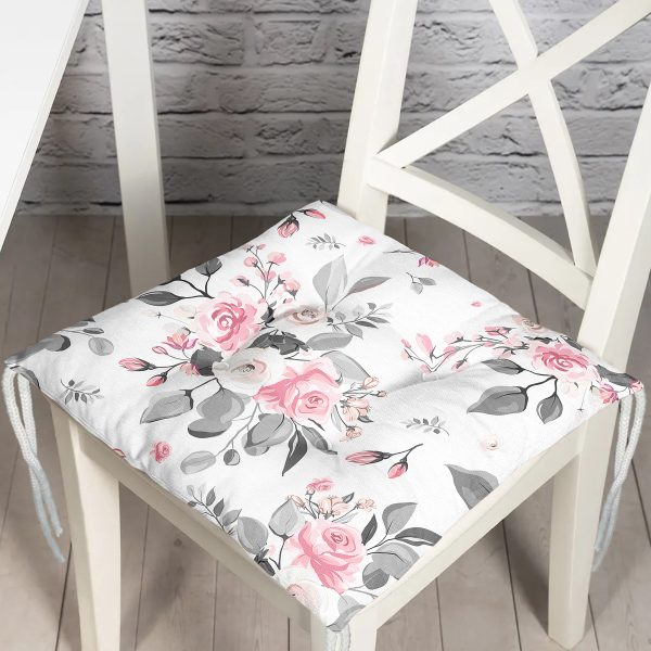 Pembe Beyaz Gül Gri Yapraklar Desenli Dijital Baskılı Modern Pofuduk Sandalye Minderi