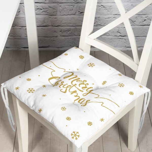 Beyaz Zeminde Gold Detaylı Kar Taneli Merry Christmas Yazılı Dijital Baskılı Modern Pofuduk Sandalye Minderi