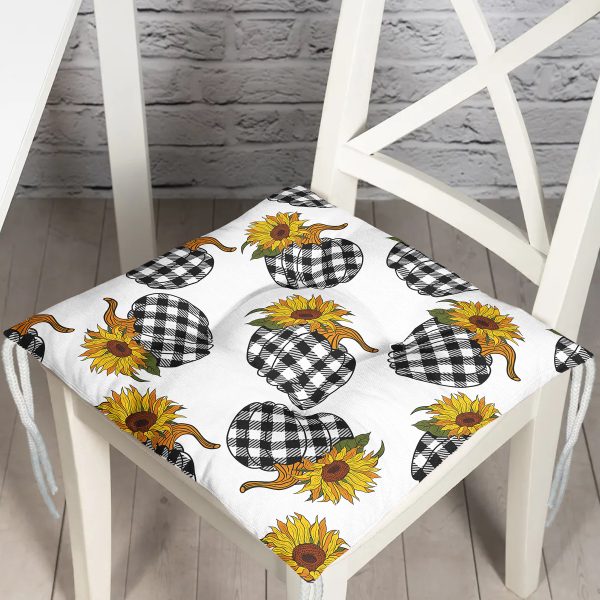 Beyaz Zemin Üzerinde Ekose Desenli Bal Kabağı Motifli Dijital Baskılı Modern Pofuduk Sandalye Minderi