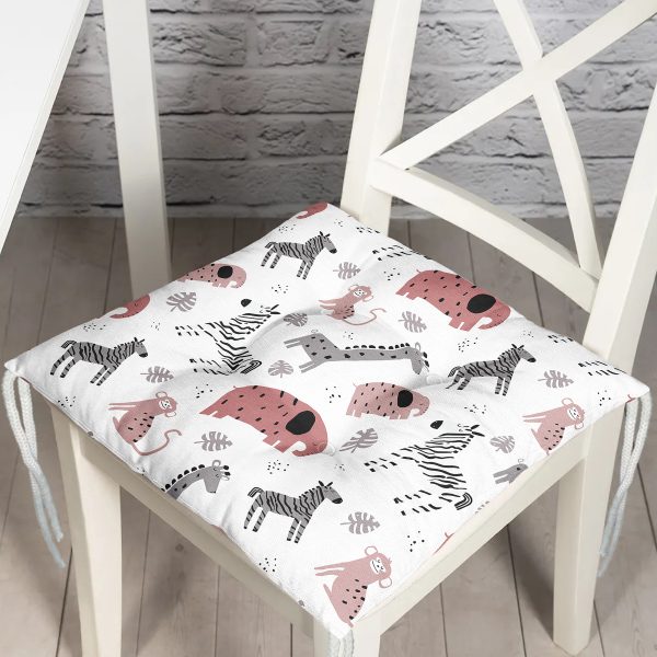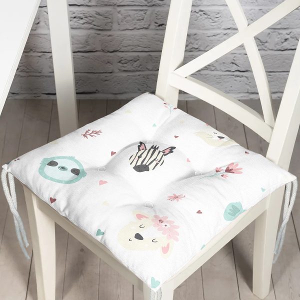 Beyaz Zeminde Sevimli Hayvanlar Dijital Baskılı Özel Tasarım Modern Pofuduk Sandalye Minderi