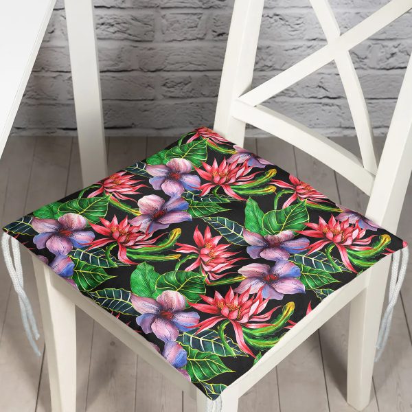 Siyah Zeminde Suluboya Tropik Bitkiler Tasarımlı Modern Pofuduk Sandalye Minderi