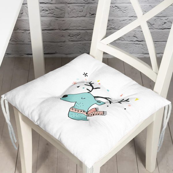 Realhomes Beyaz Zeminde Mavi Geyik Çizimli Modern Pofuduk Sandalye Minderi