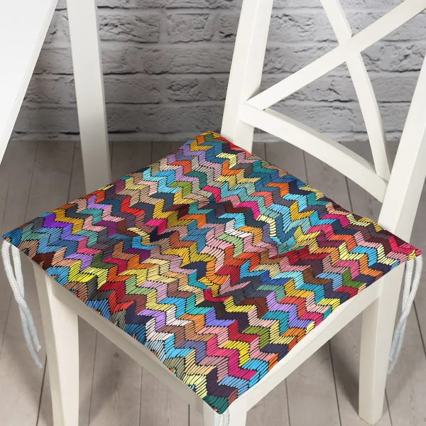 Renkli Zemin Üzerinde Geometrik Desenli Dijital Baskılı Modern Pofuduk Sandalye Minderi
