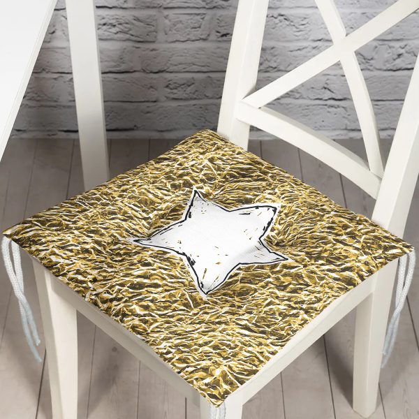 Gold Zeminli Beyaz Yıldız Desenli Dijital Baskılı Modern Pofuduk Sandalye Minderi