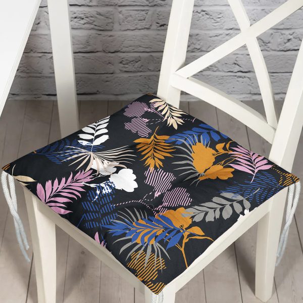 Siyah Zemin Üzerinde Renkli Yaprak Desenli Dijital Baskılı Modern Pofuduk Sandalye Minderi
