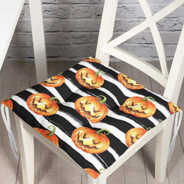 Beyaz Zemin Üzerinde Siyah Çizgili Bal Kabağı Desenli Dijital Baskılı Modern Pofuduk Sandalye Minderi