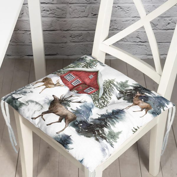 Kar Zeminli Geyik & Çam Ağacı Tasarımlı Dijital Baskılı Modern Pofuduk Sandalye Minderi