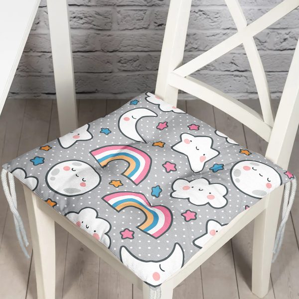Realhomes Gri Zeminde Gökkuşağı ve Ay Yıldız Tasarımlı Dijital Baskılı Modern Pofuduk Sandalye Minderi