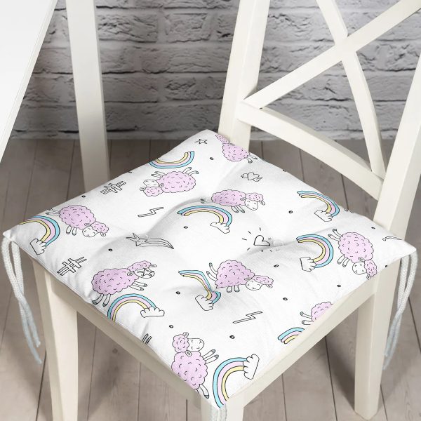 Pembe Koyunlar Ve Gökkuşağı Desenli Dijital Baskılı Özel Tasarım Modern Pofuduk Sandalye Minderi