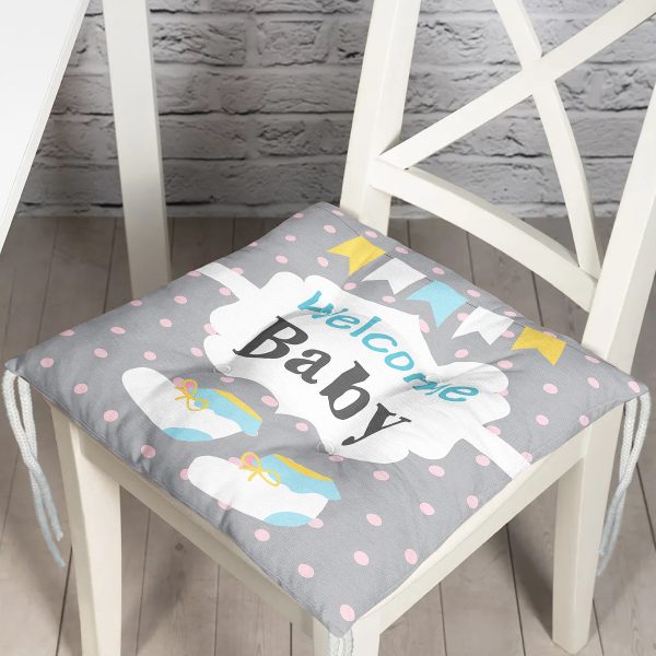 Gri Zemin Welcome Baby Yazılı Özel Tasarımlı Dijital Baskılı Çocuk Odası Pofuduk Sandalye Minderi