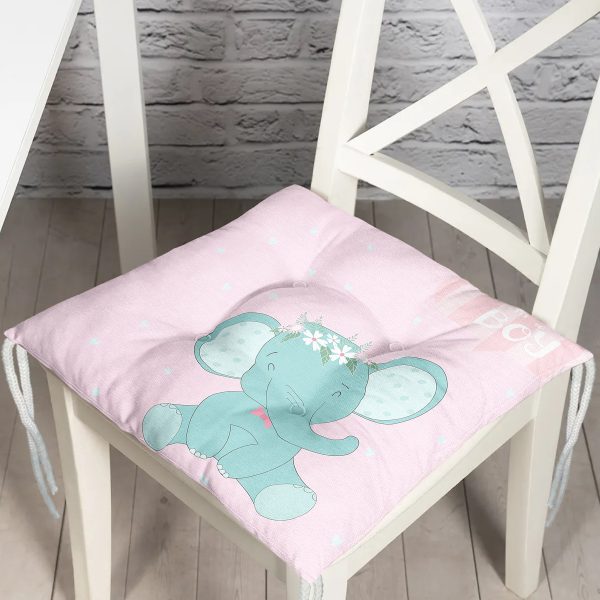 Pembe Zeminli Sevimli Fil Desenli Özel Tasarımlı Dijital Baskılı Çocuk Odası Pofuduk Sandalye Minderi