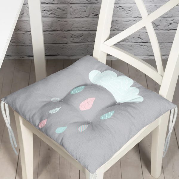 Gri Zemin Bulut Ve Yağmur Motifli Özel Tasarımlı Dijital Baskılı Modern Pofuduk Sandalye Minderi