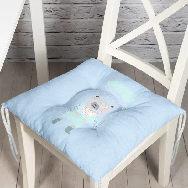 Mavi Zeminde Şemsiyeli Ayıcık Dijital Baskılı Çocuk Odası Pofuduk Sandalye Minderi