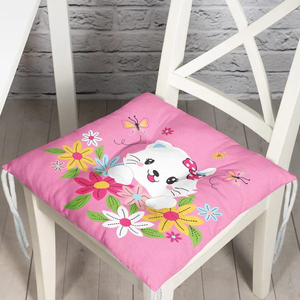Çiçeklerin İçindeki Sevimli Kedi Desenli Modern Pofuduk Sandalye Minderi
