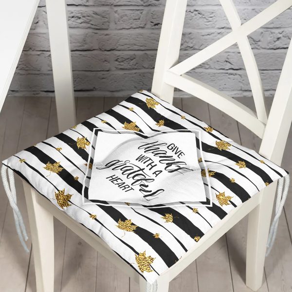 Beyaz Zeminde Gold Yapraklı Thanks Yazılı Dijital Baskılı Modern Pofuduk Sandalye Minderi
