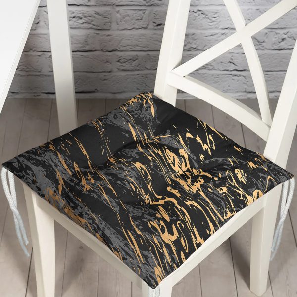 Gri Siyah Zemin Üzerinde Gold Detaylı Çizim Desenli Dijital Baskılı Modern Pofuduk Sandalye Minderi
